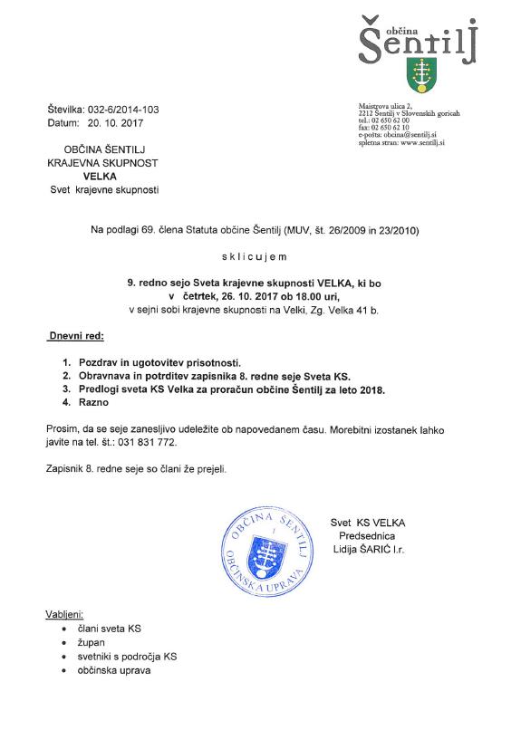 9. REDNA SEJA SVETA KRAJEVNE SKUPNOSTI VELKA